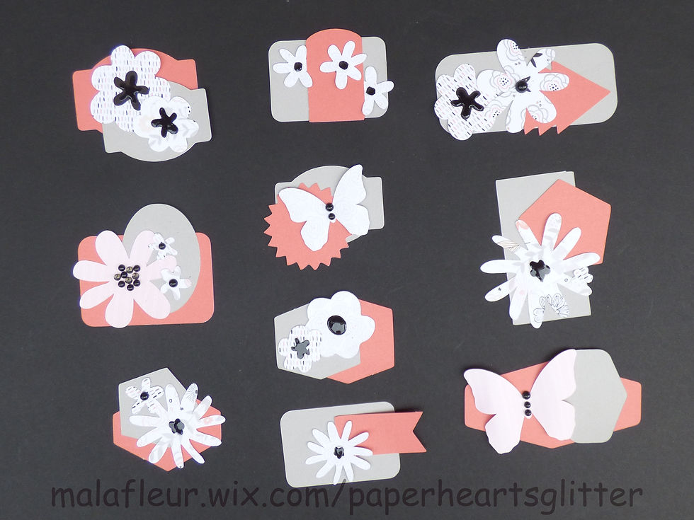 So, I came up with these. Little embellishments, that I can add to a tag, a layout, a card or anything else I need in a hurry. And the nice thing is - I used up all my little scraps. How wonderful is that!!!!